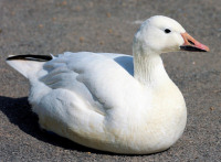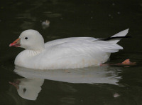 These three geese all have reddish beaks and legs, black wing-tips, and a white head with no markings. The Snow Goose has two distinct colour morphs which is either white (snows) or grey-blue (blues).