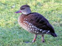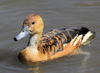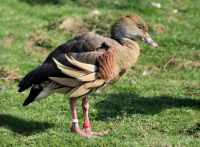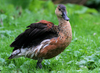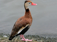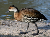 The Whistling Ducks have a long neck, long legs, and a hunched appearance. The male and female have a similar plumage and have black underwings. They also have distinctive whistling calls.