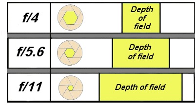The 'Aperture' is measured in f/stops (i.e. f/2.8 is a wide aperture, and f/22 is a small aperture). The 'Aperture' affects 'Depth-of-Field' (what is actually in focus in the picture). A very small 'Aperture' (high f number) gives a longer 'Depth-of-Field' which is useful in landscape photography where you need the image to be sharp from front to back. A wide 'Aperture' (low f number) will result in a shallow 'Depth-of-Field' which is useful in portrait photography where you need the subject to be in focus but the background blurred. A wide 'Aperture' will allow you to obtain a faster 'Shutter Speed'. It is also worth noting that many lenses have a better image quality when their 'Apertures' are stopped down slightly (i.e. if the maximum 'Aperture' of the lens is f/5.6 then closing the 'Aperture' to f/8 may increase image quality).