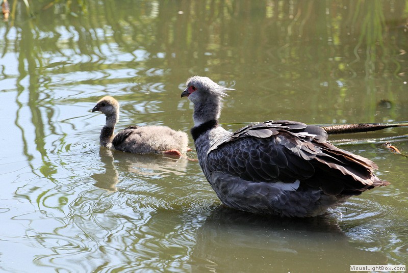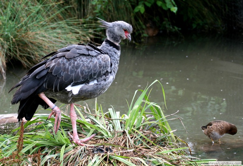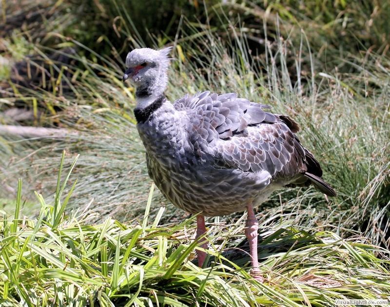 Appearance: - The Crested Screamer has a large grey body with some black and brown feathers, a small grey head with tufts of feathers at the back, a short hooked beak, a black ring around the neck, and bare red skin can be seen from the base of the beak to the eye. Their pink feet are only partially webbed. Both sexes are alike with the male usually being slightly larger.
