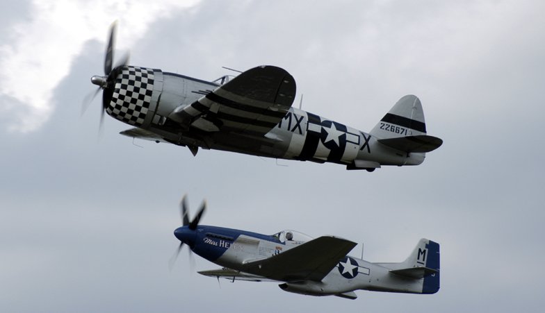 P-51 Mustang 'Miss Helen' & P-47 at RIAT on 19 July 2002. Used Nikon D-100 with Nikkor 70-300mm zoom, set for 170mm. The exposure was 1/400 at f9. Taken from