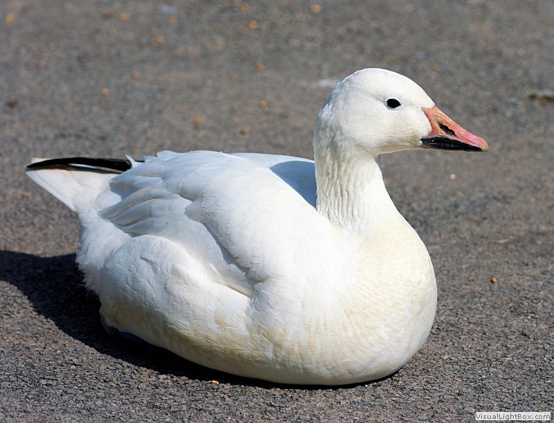 Appearance: - The Snow Goose or Blue Goose, as it is also called, has two distinct colour morphs which is either white (snows) or grey-blue (blues). The white-morph geese are all-white with black wing-tips, while the blue-morph geese have a bluish-grey plumage with a white head, neck and tail tip. Both geese have a pink beak, and reddish-pink legs and feet. Both sexes are alike.